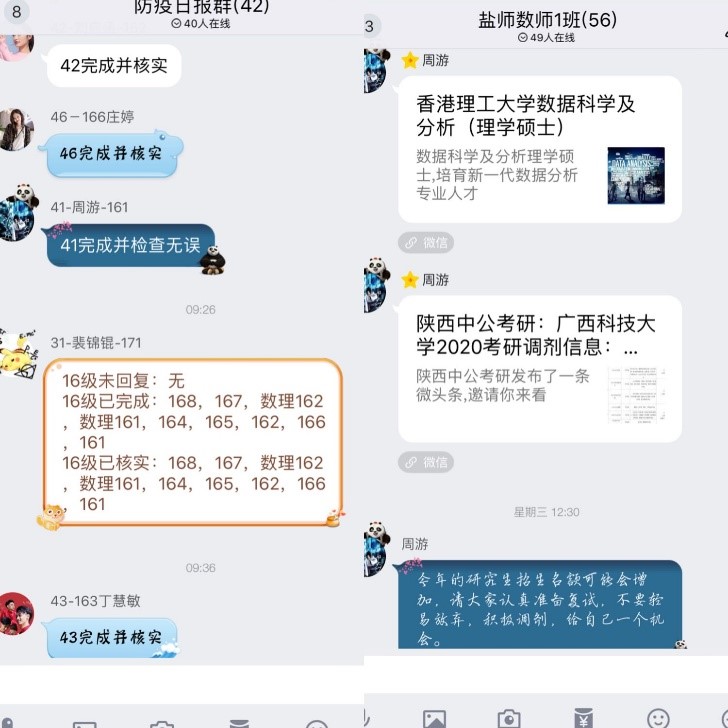 “一个支部就是一个堡垒,一个党员就是一面旗帜。”员工党员回看了翁铁慧副部长在新闻发布会上的讲话,非毕业班党员对于“先就业?还是先考研?”的问题进行了讨论;毕业班党员就推进毕业生考研、就业的具体举措进行交流,开展线上学业就业帮扶与分享活动,分享考研复试调剂信息、就业聘信息,及时疏导班级同学焦虑、恐慌等负面情绪,帮助他们树立积极应对考研、就业的信心,用自己的行动在防控疫情中守初心,担使命,用勇气和智慧作表率,尽其能,显担当。
