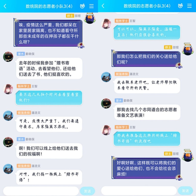 “防疫不防情,我们在行动。”“赠书寄语”“云活动”发起者潘浩文同学开心地说:“去年,我作为志愿者第一次参加了‘赠书寄语’活动,在一对一交流帮扶中联系了未成年在押人员小王,一直与他保持书信交流,快一年了,我想看一看他的变化,他想和我聊一聊他未来的打算,我们对面对面交流充满了期待。受到疫情影响,我们志愿者不能像往年一样走进看守所开展活动,于是我们自发组织策划、准备线上‘赠书寄语’活动,得到了老师和看守所警官的大力支持。我们通过开展云活动将我们的关心关爱送达,我们做到了!”