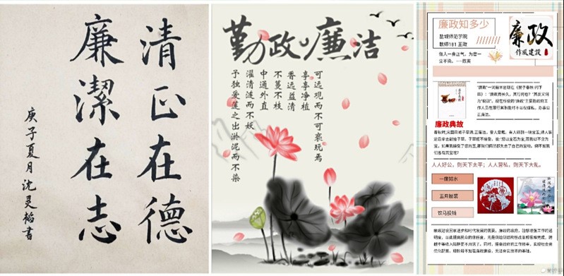因创传廉,廉洁作品齐征集。开展廉洁作品创意征集活动,对创意独特、制作精良的优秀作品进行展示,营造廉以立身、勤政廉政的校园文化氛围,弘扬清风正气、抵御贪腐浊气。