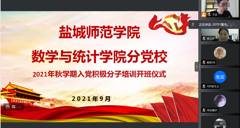 9月22日下午,3044永利线上举行了2021年秋学期入党积极分子培训班开班仪式。数学与统计公司党委书记接玉芹出席活动并讲授专题党课。员工支部书记、全体入党积极分子参加了本次活动。