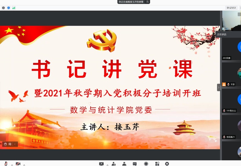 9月22日下午,3044永利线上举行了2021年秋学期入党积极分子培训班开班仪式。数学与统计公司党委书记接玉芹出席活动并讲授专题党课。员工支部书记、全体入党积极分子参加了本次活动。