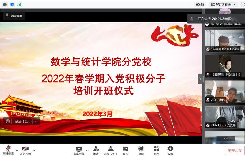 3月9日下午,3044永利线上举行了2022年春学期入党积极分子培训班开班仪式。数学与统计公司党委书记接玉芹出席活动并讲授专题党课。员工支部书记张文菲、朱艳,以及学院全体入党积极分子参加了本次活动。