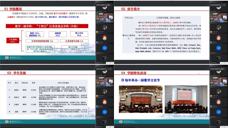 宣讲会上,南京财经大学应用数学学院副经理孙成峰从学院概况、招生简介、员工发展情况、学院特色活动四个方面介绍了应用数学学院相关情况,通过往年数据分享了学院教学科研成果、着重介绍了主要学科方向,希望大家对自身要有清晰的认知和合理的判断,在志愿填报方面做足功课,以期未来获得更好的发展。