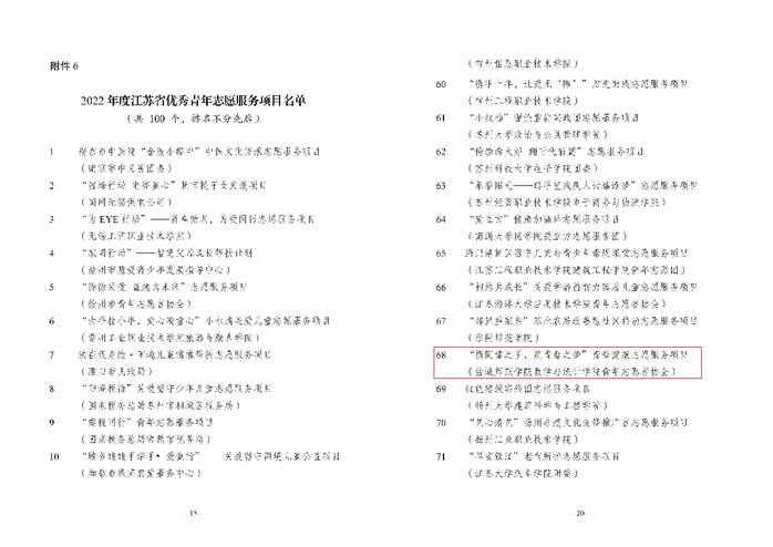 日前,江苏省青年志愿者协会开展了2022年度全省青年志愿者行动评选工作,经学校推报,省青年志愿者协会资格初审和专家评审,公司“携同辈之手,筑青春之梦”青春健康志愿服务项目获评“2022年度江苏省优秀青年志愿服务项目”。
