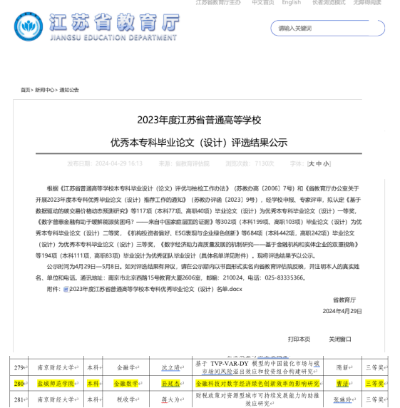 4月29日,江苏省教育厅公布了《2023年度江苏省普通高等学校优秀本专科毕业论文(设计)评选结果公示》,公司曹洁老师指导的《金融科技对数字经济绿色创新效率的影响研究》(作者:孙延杰)获三等奖。
