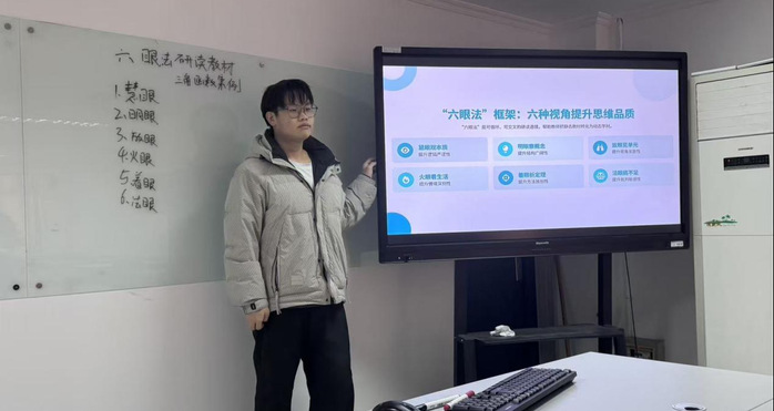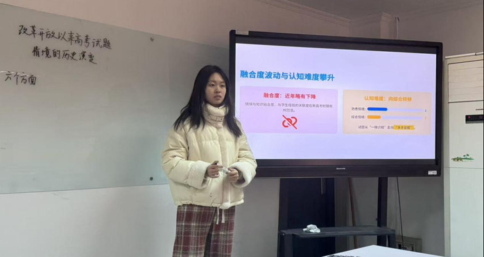 汇报环节中,戴模以“教学评一致性”为理论支架,探讨如何推动数学课堂从知识传授向素养培育深化。丁妍系统梳理改革开放以来高考试题情境的历史演变,并从六个维度展开逐层剖析。王婧结合教育改革背景,指出传统教学模式难以满足员工发展需求,进而阐释微项目化学习与“综合与实践”课程相融合的现实意义。刘宇则以人教A版“三角函数”整章内容为例,示如何运用“六眼法”研读教材,超越文本表层,把握数学思维本质。